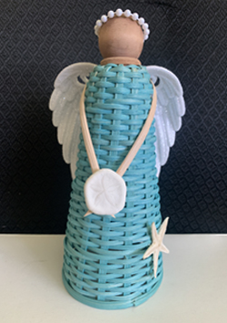The Angel of the Sea is woven in dyed reed on a styrofoam mold, which may be removed or left inside. Rims, arms, wings, shells, and head will be glued or tied on in place. Assortment of shells available.