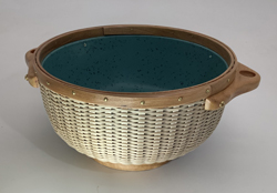 This will be a short run of baskets under the name Mid-Century “Aqua” limited. A quality aqua colored bowl is your form and becomes a permanent fixture of your basket. Woven with 100% Black Ash processed by Eric and finished with Cherry handles and rims.