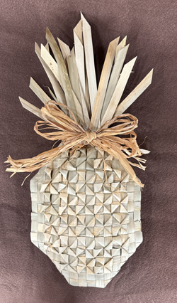 Students will create a pineapple woven with lauhala. Lauhala is the primary weaving material used in Hawaii. It’s a double sided weave so the body will be stuffed. We will apply a texture weave to the body of the pineapple and the top will be tied with raffia. Students can add a rose (made by the teacher) if they want.