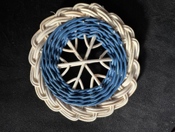 This beautiful basket is woven with natural and dyed reed. Students will triple twine and weave a twill pattern around a beautiful handcrafted wood base that features an inlaid shell.