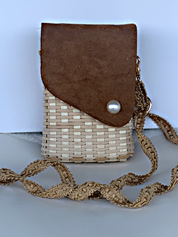 This is woven on a mold with a continuous weave in natural reed. The beautiful suede flap is embellished with a faux pearl and has a magnetic closure. It has a foam lining to prevent damage to cell phones. Large enough for cell phones and essentials. It has a crossbody strap.