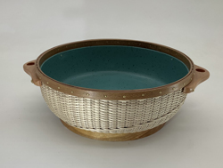 This will be a short run of baskets under the name Mid-Century “Aqua” limited. A quality aqua colored bowl is your form and becomes a permanent fixture of your basket. Woven with 100% Black Ash processed by Eric and finished with Cherry handles and rims.