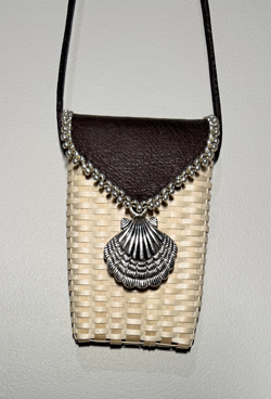 Designed to fit a hotel room key card or credit card, this updated necklace pouch is lovely as well as useful. Chase woven of finely prepared black ash splint over a wooden mold, the shell charm will remind you of the beach. Learn to embellish the leather flap with a beaded picot edge.