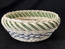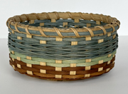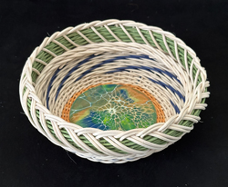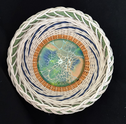 Woven on a round wood base. Colors match the Ocean Waves Wall and the Large Cuisine Plate Basket. Will work on shaping and arrow triple twine, which gives it the ocean wave look. The basket also fits nicely inside the Large Cuisine Basket for travel/packing space.