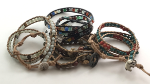 This is a fun project, woven on leather chord with stone or glass beads. A hot fashion statement right now! This “Ladder Woven” wrap bracelet is a fun bracelet to weave and lovely to wear! A Large selection of prepared kits available with everything needed to complete the bracelet. *Additional sterling silver charms or special buttons are available for purchase, if desired.