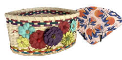 The triangular base has a modpodged scrap book paper. The dyed reed is bright and colorful. Twining and stop-start are the weaving techniques. Emphasis and hints are given to keep spokes straight up - especially on the 3 corners. You design the placement of the paper flowers. Colors available at class time.